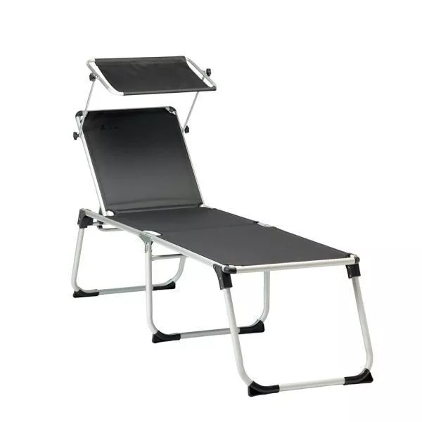 Die Isabella Sonnenliege mit verstellbarem Kopfteil und Sonnenschutz ist eine weich gepolsterte Campingliege oder Strandliege. Der Bezug ist wetterfest. Die Liege lässt sich leicht zusammenlegen und ist trotz leichtem Aluminiumgestell bis 120 kg belastbar.